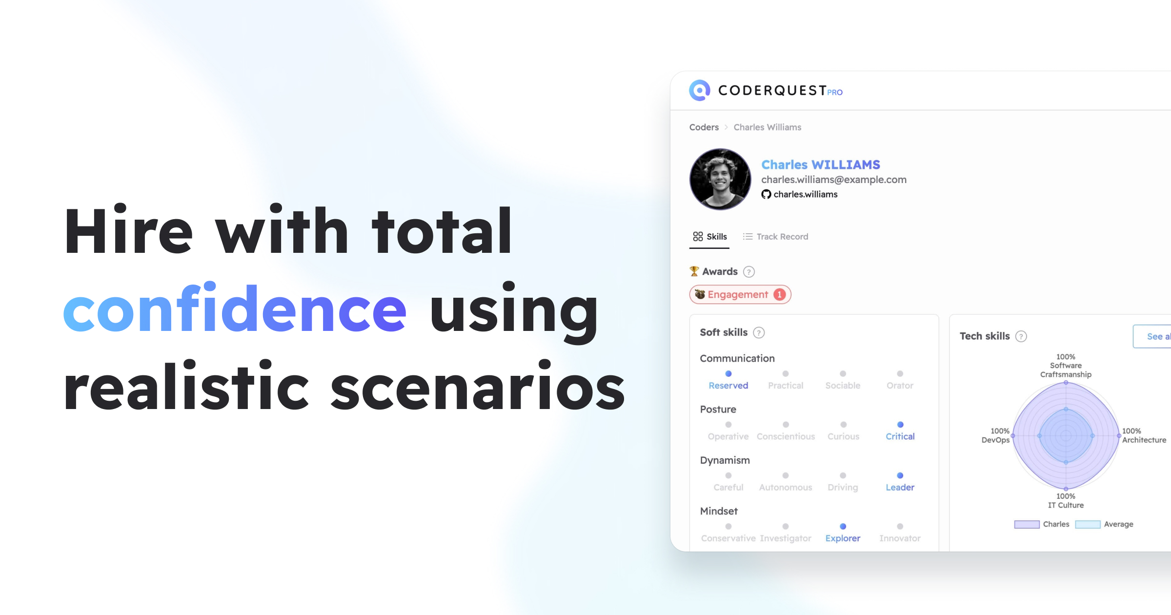 Based on the Coders’ behaviour in the simulation, soft and tech skills, English understanding and writing, and stack specific dev skills are automatically analyzed, so you can get a complete overview of their mindset.